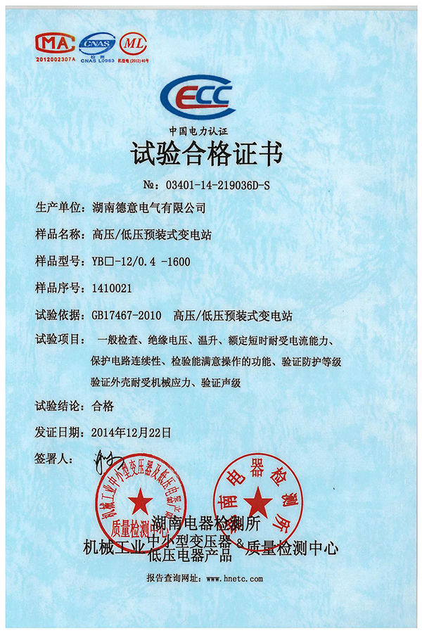 YB□-12/0.4-1600型箱式變?cè)囼?yàn)合格證書